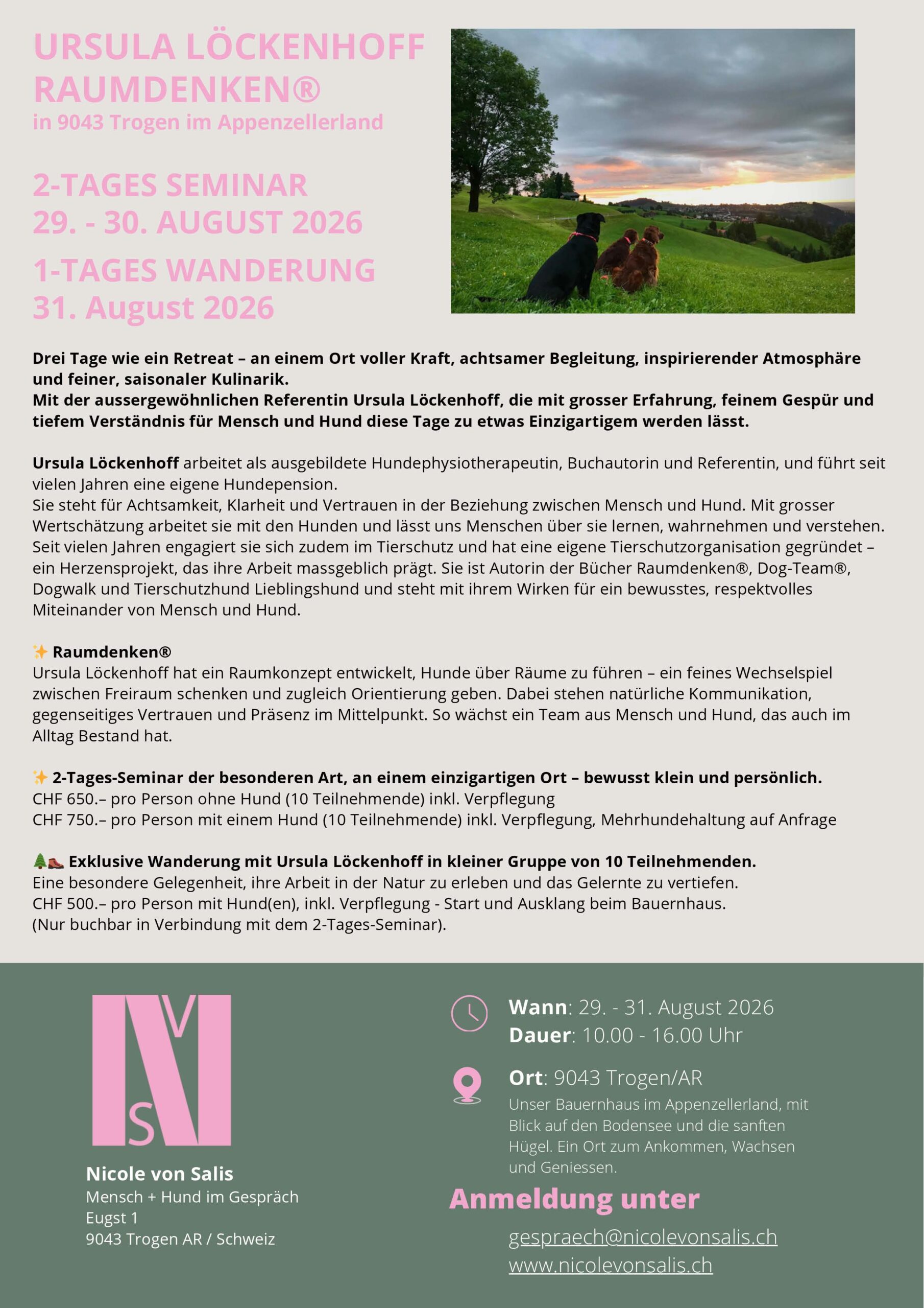 Drei Tage wie ein Retreat – an einem Ort voller Kraft, achtsamer Begleitung, inspirierender Atmosphäre und feiner, saisonaler Kulinarik. Mit der aussergewöhnlichen Referentin Ursula Löckenhoff, die mit grosser Erfahrung, feinem Gespür und tiefem Verständnis für Mensch und Hund diese Tage zu etwas Einzigartigem werden lässt.